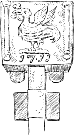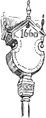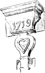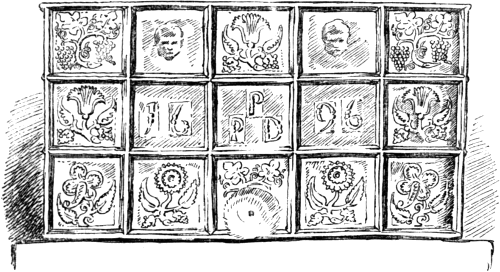 The earlier pipes were almost always a flat square, sometimes ornamented up its whole length, but usually only at the collars, where the bands of lead for attachment to the wall were placed, here and on the flaps of the collars are often crests, flowers, or letters. The lead band was cut long enough, so that after the nails had been driven through it into the wall the ends were folded back over their heads. Those at Canons Ashby, Northants, have the ends curled and cut like the scroll of a mediæval text.