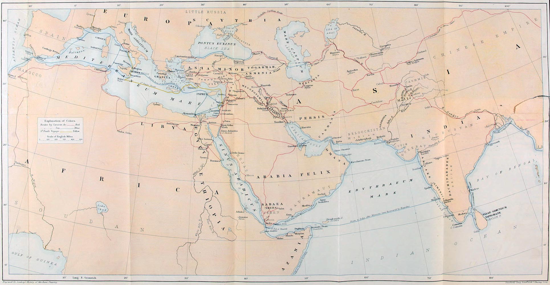 | Route viâ the Cape to India, discovered by the Phœnicians, B.C. 610-594—Voyage of the first Eudoxus—Story of the second Eudoxus (of Cyzicus)—Opinion of Dr. Vincent on the circumnavigation of Africa—Remarks upon his opinion—Routes to India and to the East by land—Origin of the caravans—Resting-places—Their management—The more important routes—Eastern—Southern—Northern—The character, size, and discipline of the caravans—The route from Sardes to Susa, described by Herodotus—Between Tyre and Gerrha—Length of journey—Importance of Petra—Intercourse between Syria and Babylon—Value of the trade of Babylon—Caravan routes from that city to Candahar, Cashmir, Ecbatana, and Peucela on the Indus—Earliest land and sea combined routes—Commercial efforts of Alexander in the East, and the impetus he gave to the development of the trade with India by the erection of Alexandria, B.C. 331—Time of the departure of the fleets—Residence of the merchants and course of trade from Alexandria to the East—Value of the trade with India—The ports through which it was conducted—Course of the voyage to India—Outwards—Homewards—The vessels engaged in the trade with India—The nature of their cargoes—Immense demand at Rome for the luxuries of the East, and the enormous prices paid for them—Imports and exports to and from Pattala—Barygaza or Baroach—Musiris—Cape Comorin—Ceylon—Time of departure of the fleets for Africa and the coasts of Arabia—Rhapta, or Quiloa—Sofala—Articles of commerce—Moosa—Yemen, or Arabia Felix—Its great wealth, and the importance attached to its trade—Kane—Sachal—Moskha—Maskat—Omana | 79-121 |