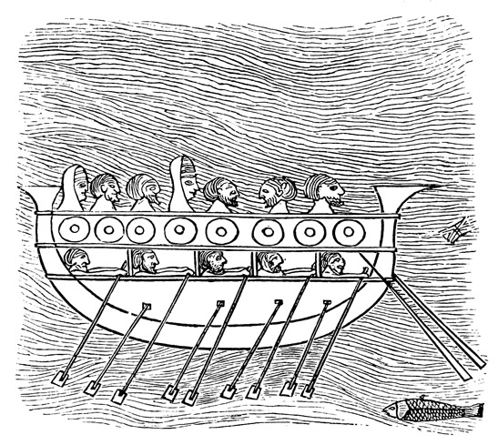 Introductory—The first attempt to float, by means of a hollowed log and raft—The Ark—Boats of skin—Earliest boats or ships—Their form—Mode of construction—Names of ships—Decorations—Launching, &c.—Master—Mate—Boatswain—St. Paul’s ship—Rig and sails—Undergirders—Anchors and cables—Decks—Nautical instruments—Mariner’s compass—Speed of ancient ships.