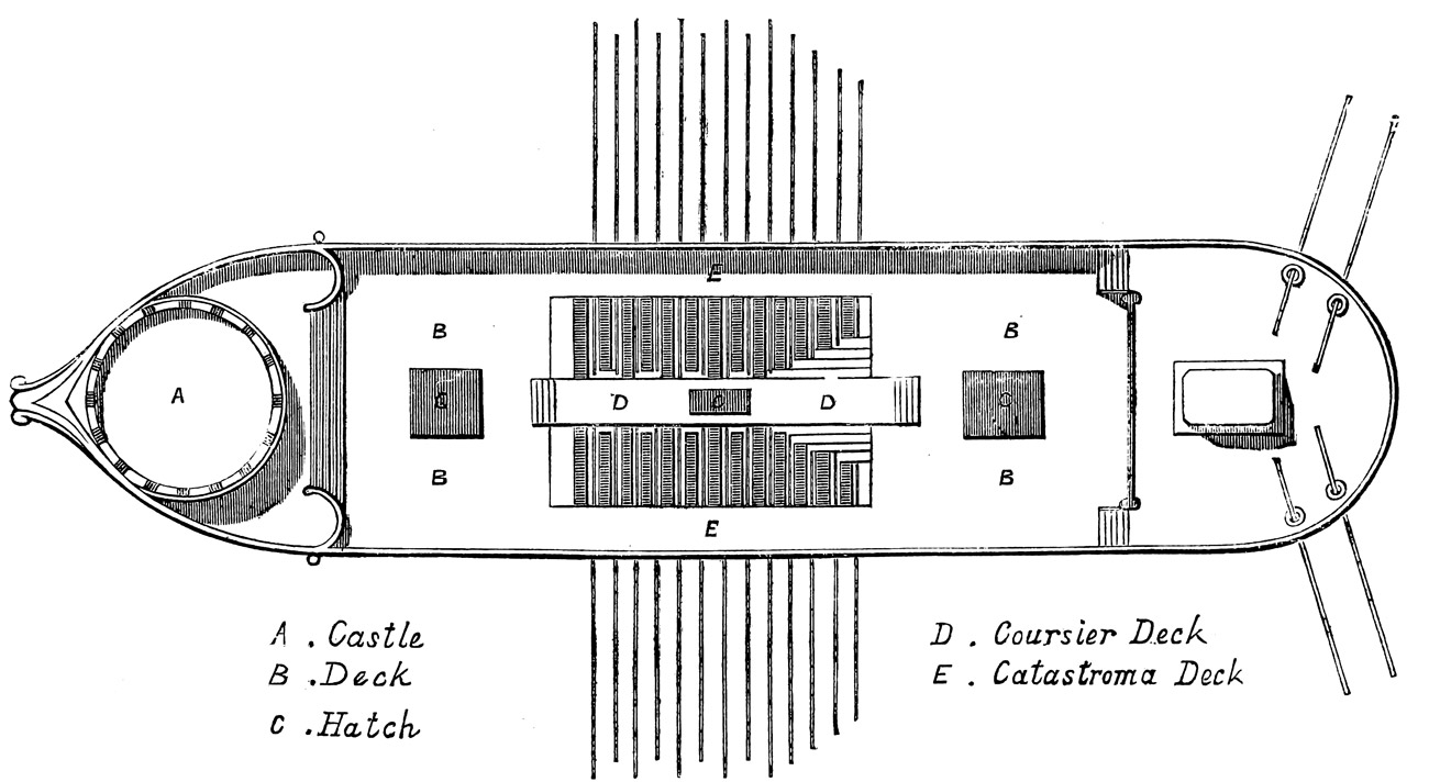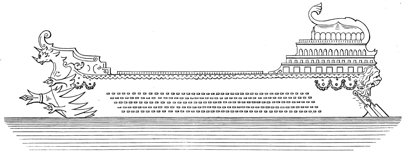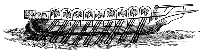 | Ancient galleys—Different descriptions—Their outfit—Beaks—Stern—Masts and sails—Oars—Mode of rowing—Single-banked galleys—French galley—General Melvill’s theory—Charnock’s theory—Vossius’s views—Mr. Howell’s plan—Plan of Rev. J. O. W. Haweis (Appendix No. 1)—Our own views—Biremes—Triremes—Quadriremes—Quinqueremes—Hexiremes and larger galleys—Suggested plan of placing the rowers—Summary | 253-297 |