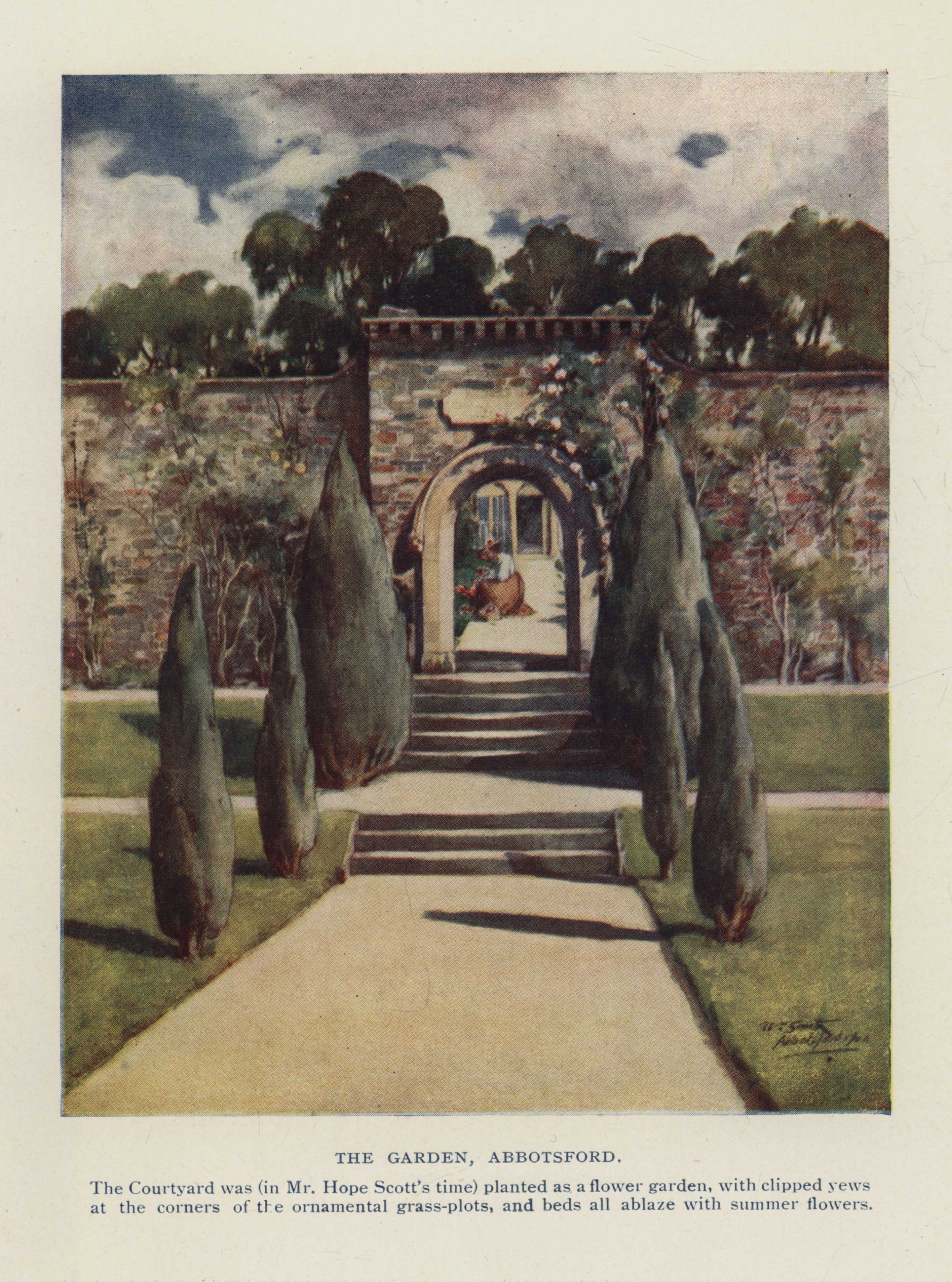 Abbotsford had been sadly neglected since Scott's death in 1832, and everything needed restoration. But Mr. Hope Scott did wonders. Between the years 1855 and 1857 he built a new west wing to the house, consisting of a Chapel, hall, drawing-room, boudoir, and a suite of bedrooms. The old kitchen was turned into a linen-room, and a long range of new kitchen offices facing the Tweed was erected, which materially raised the elevation of Scott's edifice, and improved the appearance of the whole pile as seen from the river. An ingenious tourist access was also arranged, with other internal alterations. Outside, the grounds and gardens were completely overhauled, the overgrown plantations thinned, and the old favourite walks cleaned and kept as Scott himself would have wished. In the lifetime of the Great Magician the ground on which he fixed his abode was nearly on a level with the highway running along the south front, and wayfarers could survey the whole domain by looking over the hedge. A high embankment was now thrown up on the road-front of Abbotsford, the road itself shifted several yards back, the avenue lengthened, a lodge built, and the new mound covered with a choice variety of timber, which has now grown into one of the most pleasing features of the Abbotsford approach. The courtyard was at the same time planted as a flower-garden, with clipped yews at the corners of the ornamental grass-plots, and beds all ablaze with summer flowers. The terraces, on the north, so rich and velvety, date from this period.