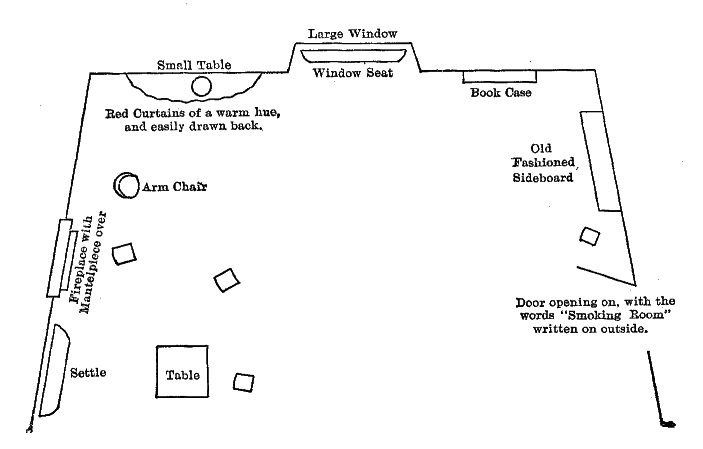 All lights out, dark stage. Opening music. Curtain rise—ticking of clock heard. Wind, then church clock chimes, the Lights come very slowly up, when the red glow is seen in the fireplace the low murmurs of the characters heard, and gradually get louder as lights come up to when Somers' voice tops all.
