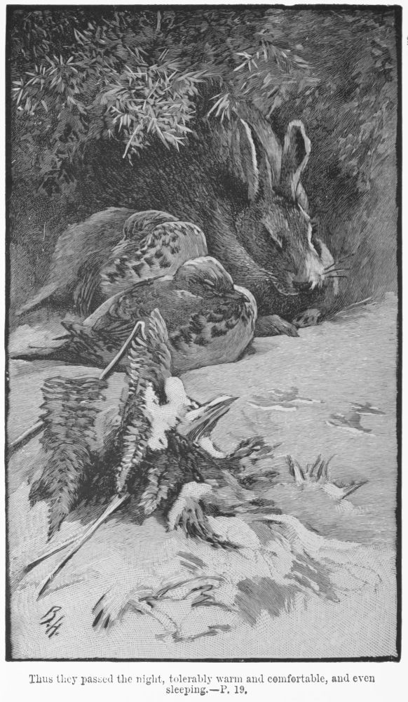 It was not a fox; it was a hare. Puss came softly in behind the ruined cottage, and crouched down quietly close to the birds. They kept perfectly still. When she was fast asleep Cocktail whispered to Feltie to move up to her, and did so himself, getting as near her warm breath as possible. Feltie followed his example. And thus they passed the night, tolerably warm and comfortable, and even sleeping. Puss never offered to stir, and was still fast asleep when they left her in the morning.