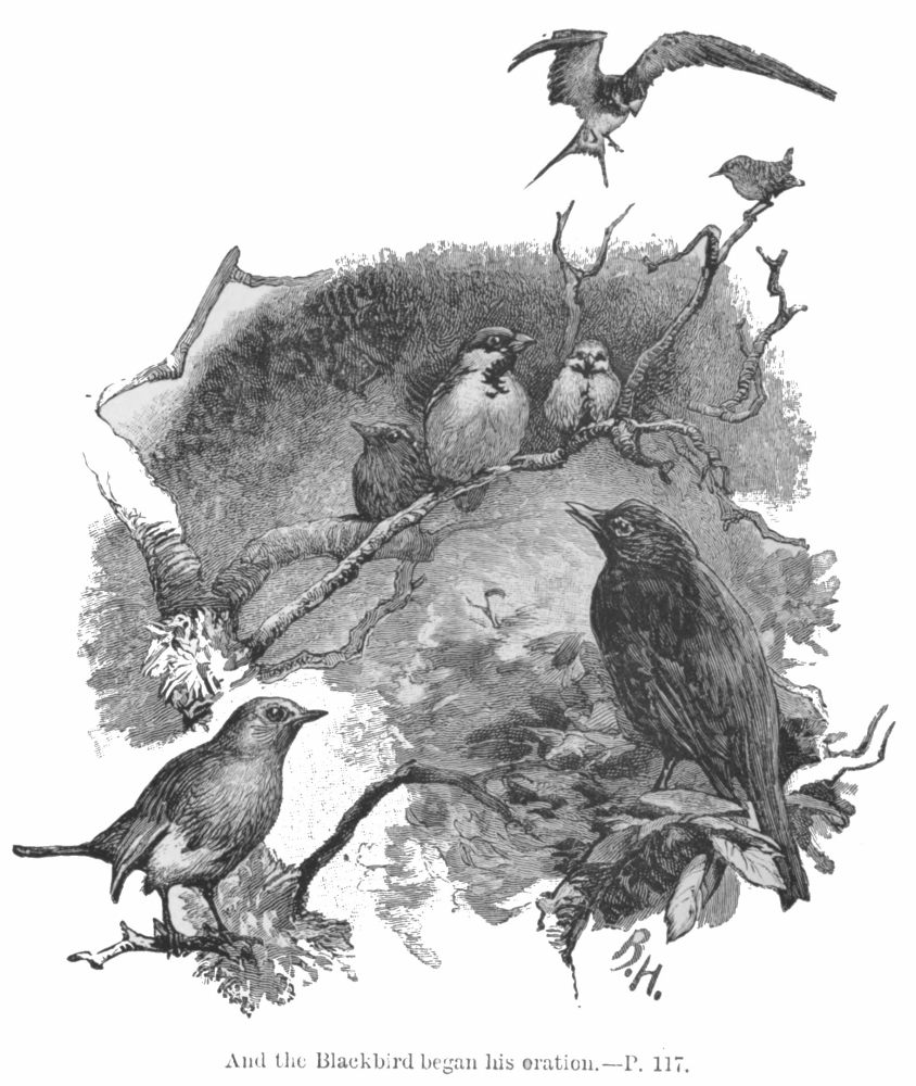 “Shame!” said he indignantly; “but there must be more of them in the garden.” And bidding the others follow, he flew down into the well-planted grounds. They here found themselves nearer to human habitations than they had ever been in their lives before; but hunger made them bold. “To right and left,” said Cocktail, “and look for holly-bushes.” His own search was a failure; he found several bushes, but not a berry was left. He felt very angry when he thought of the rich store of berries inside that cosy room, where no starving birds could get at them. There was the well-fed lady enjoying her tea by the fire, and looking with admiration at the berries (looking indeed, thought Cocktail, and not eating them!), and here were four poor birds starving outside in the cold for want of them.