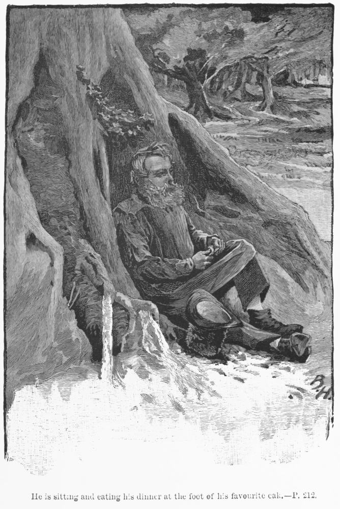 He is sitting, and eating his dinner, at the foot of his favourite oak, which is separated by a few yards of bluebells and undergrowth from one of the grassy rides, or “lights” (as we call them) which intersect the wood, and let sunshine and fresh air into its tangled depths. It is his favourite tree, partly because its gray-lichened stem divides on one side, as it nears the ground, into two big root-branches which leave a comfortable space between them—a mossy arm-chair of which he only knows the comfort who has toiled since daybreak without ceasing; and partly because the tree is old, as old as the abbey of Truerne which once stood under the shadow of the wood in the meadows below; and because it is hollow enough to be the home of a family of brown owls, whose ancestors had been tenants of the wood long before the monks became its owners. These owls were some of Oliver’s best friends; he seldom saw them, nor they him; but, boy and man, he had known them for more than half a century, and knew them well to be discreet and quiet creatures, who did no harm and gave no trouble to any one but vermin. There was