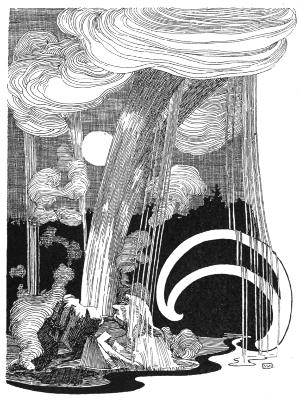 Ngawai listens to the narrative of the old Rangi-o-mohio whilst her eyes are gazing upon the sacred Tongariro. The moon has risen over the lake, and a fine silvery gleam is glittering upon the snow of the mountain, which is sending its beautiful column of silver high up into the skies. Then once more Ngawai looks sorrowfully back, and goes on her way to her people in the distant pa.