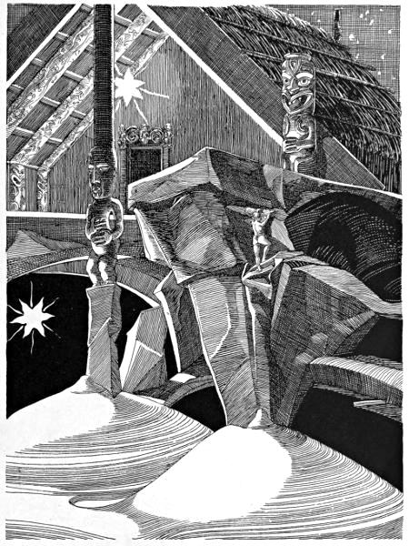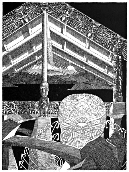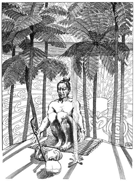 Dreamily is Ngawai staring into the embers, whilst the pale new morning is crawling through the spaces between the fern-stems which form the walls of the mountain-whare (hut).