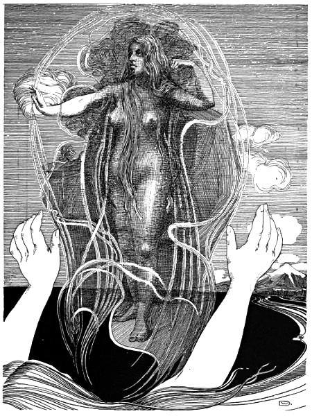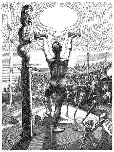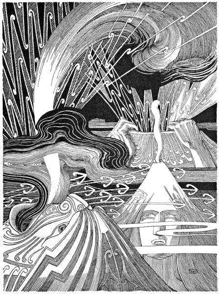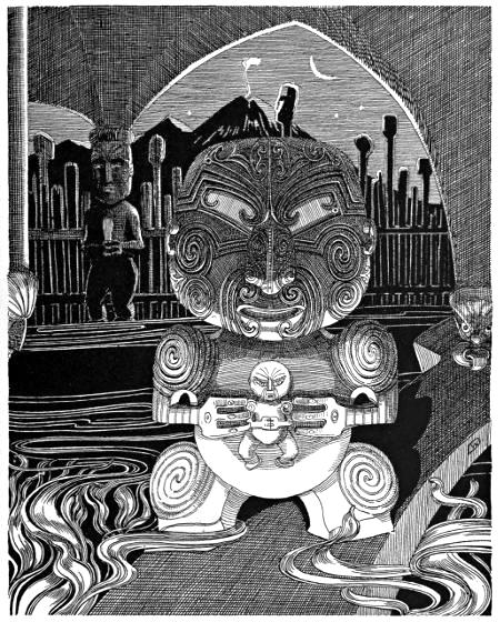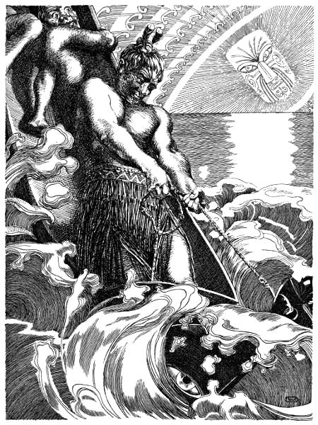 And the mana tapu, the supernatural influence of that awa-moana, and of the Tohunga, was such that the terrific lashing of the sea was calmed, the gaping whirlpool closed again; the great billows ceased to tumble, the heavens grew light, and the canoe sailed on once more in safety over the long heaving swell of the Ocean of Kiwa. Magical indeed was that ringing sea-chant of Ngatoro’, as potent in its peace-compelling numbers as that mermaid’s song of which Oberon discoursed to Puck in A Midsummer Night’s Dream:—
