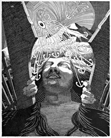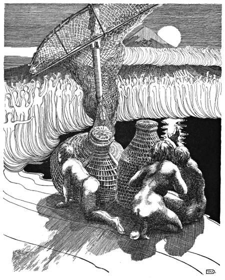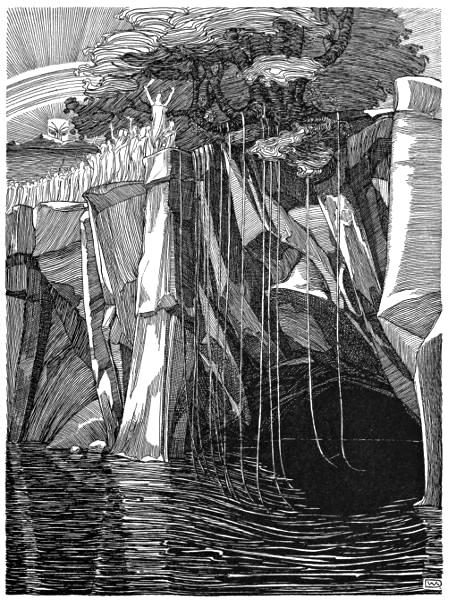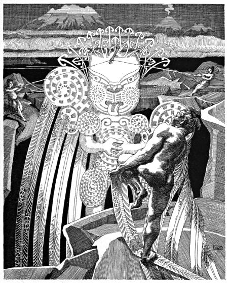 Distant thunder rolls, shaking the ground, and the sulphur-fumes press fiercely beneath the broadening steam-column. Hard and heavy breathe the bearers; terror at the temerity of the undertaking, which violates the sacredness of the mountain, grows in the heart of their leader.