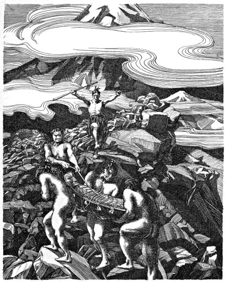 The vast world stretches all around, and the people who surround the dead Rangatira seem tiny and powerless as the mountain defends his sacred crater with mighty bursts of steam and smoke and rolling thunder and suffocating fumes. Overawed by terror the strength of the bearers fails: they let fall their burden upon a rock; the hearts of the bravest are trembling.