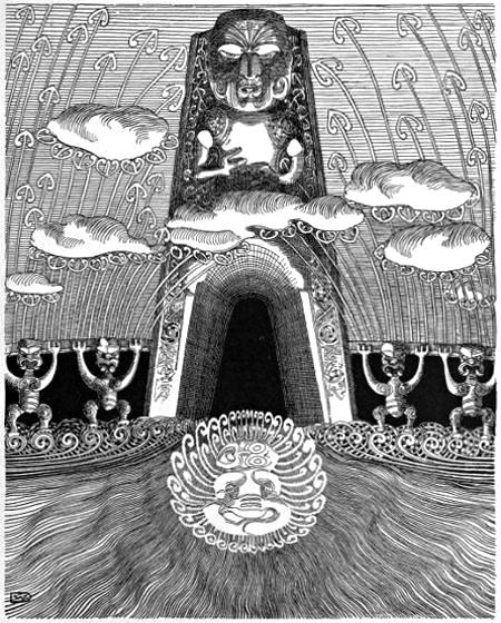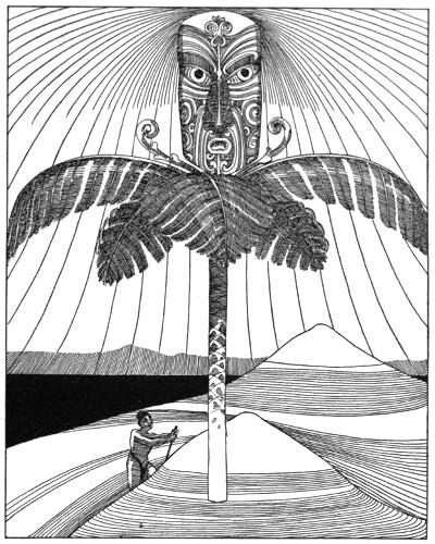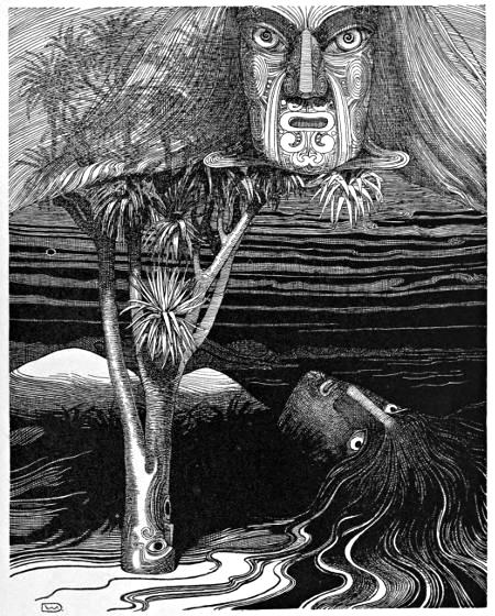 Down along the narrow ridge to the tideway they move, until they reach the ghostly leaping-place, tapu to the manes of the innumerable multitude of dead. Here grew a venerable pohutukawa tree, gnarled and knotty, with great ropy roots trailing to the tide. By these roots the spirits dropped to the sea, loosing their last grip of Ao-tea-roa to the dirge of the screaming sea-birds and the moaning waves. Below, the tossing sea-kelp opens a moment to receive the wairua, and then the dark waters close over them for ever. This is the Tatau-o-te-Po, the Door of Death, which is the entrance to the gloomy Kingdom of Miru, the Goddess of Eternal Night.