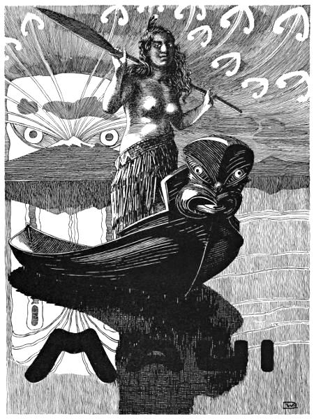While crossing the ocean in search of the new land Ao-tea-roa, Tama-te-Kapua clandestinely gained the affections of the lady Kearoa, the wife of Ngatoro-i-Rangi, who had accompanied her husband. When Ngatoro’ discovered this, he resolved to destroy the canoe and all that were on board. So to this end he directed the bow of the Arawa straight towards the Waha-o-te-Parata, the Mouth of the Sea-monster, a terrible whirlpool, or maelstrom, in mid-ocean, which had sucked down many a vessel to destruction. The sea-battered craft entered the outer circle of the maelstrom, swiftly approached the fatal spot where the Ocean God drew down the waters with an awful, roaring noise. The people in their terror cried to Ngatoro-i-Rangi to save them, but he heeded not. Then stood up Ika, one of the chiefs on board, and recited a karakia to Rangi, the Sky God, praying him to save the canoe, te-kaokao-o-Tane, the ribs of Tane the Tree God, and beat down the angry waves of Tangaroa.