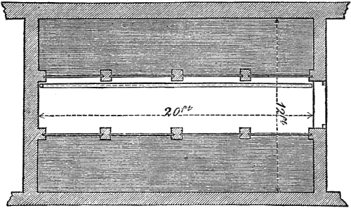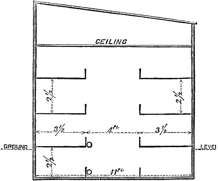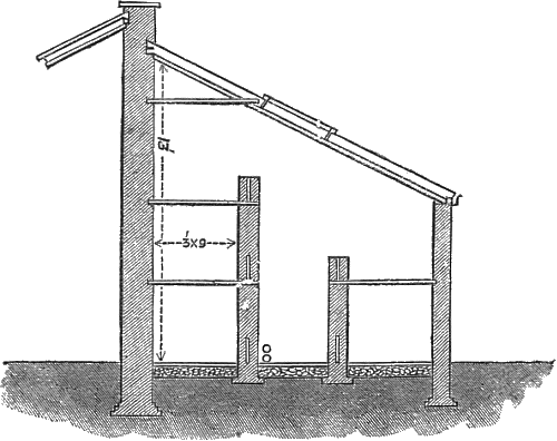 The floor may be of paving tiles, or bricks, laid on concrete: a skylight or two may be fixed in the roof, for the purpose of admitting a little light, and air when necessary. The engraving (fig. 2), shows a house of this description, 12 feet wide by 20 feet long, inside measure, but, of course, the length may be extended as circumstances may require.