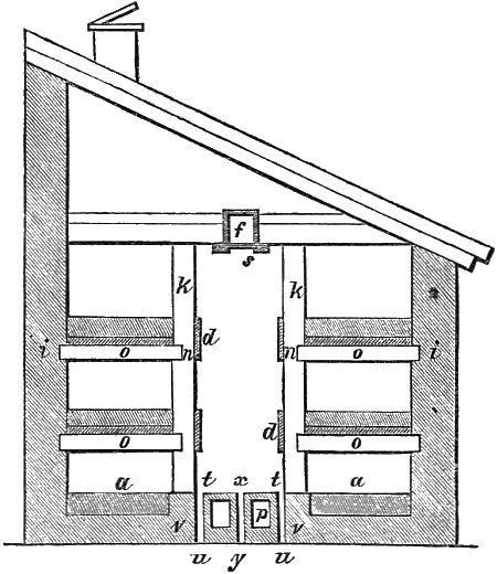 The Russian mushroom-house (fig. 10) is thus described by Mr. Oldacre, in the Horticultural Society’s Transactions, vol. ii. first series. “The outside walls should be 8½ feet high for four heights of beds, and 6½ for three heights, and 10 feet wide inside the walls. This is the most convenient width, as it admits of shelves 3½ feet wide on each side, and affords a space through the middle[10] of the house 3 feet wide, for a double flue and a walk upon it.” Hot-water pipes were not in use when this house was erected. “The walls should be 9 inches thick, and the length of the house as may be judged necessary. When the outside of the house is built, place a ceiling over it (as high as the top of the walls) of boards 1 inch thick, and plaster it on the upper side with road sand well wrought together, 1 inch thick, (this will be found superior to lime), leaving square trunks, f, in the ceiling 9 inches in width, up the[11] middle of the house, at 6 feet distance from each other, with slides, s, under them, to admit and take off air when necessary. This being done, erect two single-brick walls, v v, each five bricks high, at the distance of 3½ feet from the outside walls, to hold up the sides of the lower beds, a a, and form one side of the air-flue, t u t u, leaving 3 feet up the middle, t x t, of the house for the floor. Upon these walls, v v, lay planks, t u, 4½ inches wide and 3 inches thick, in which to mortise the standards, t k, which support the shelves. These standards should be 3½ inches square, and placed 4 feet 6 inches asunder, and fastened at the top to the ceiling joists. When the standards are set up, fix the cross-bearers, i n i n, that are to support the shelves, o o, mortising one end of each into the standards, n, the other into the walls, i. The first set of bearers should be 2 feet from the floor, and each succeeding set 2 feet from that below it. Having thus fixed the uprights, t k, and bearers, i n, at such a height as the building will admit, proceed to form the shelves, o o, with boards 1½ inches thick, observing to place a board, d d, 8 inches broad and 1 inch thick, in the front of each shelf, to support the front of the beds. Fasten this board on the outside standards, that the width of the beds may not be diminished. The shelves being completed, the next thing to be done is the construction of the flue (p in section), which should commence at the end of the house next to the door, run[12] parallel to the shelves all the length of the house, and return back to the fireplace, where the chimney should be built; the sides of the flue inside to be of the height of four bricks laid flatways, and 6 inches wide, which will make the width of the flues 15 inches from outside to outside, and leave a cavity, t u, on each side betwixt the flue and the walls that are under the shelves, and one, x y, up the middle, betwixt the flues, 2 inches wide, to admit the heat into the house from the sides of the flues.” The introduction of this form of house by Mr. Oldacre has led to much improvement in our mushroom culture. The first house of this kind erected in England, was built at Shipley, near Derby, in the garden of E. M. Mundy, Esq., by the father of Mr. W. P. Ayres, whose name will be found frequently mentioned in this work. There brick arches were formed for the shelves, and though built more than half a century ago, the house is still in good condition.