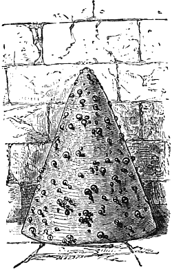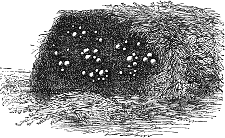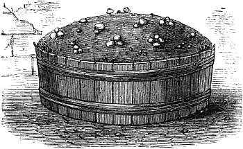 But inasmuch as in this country, at present, but little mushroom-spawn is required in any one place, the rule is to obtain artificial spawn in the form of hard bricks. This spawn is made from horse-droppings and some cowdung and road scrapings beaten up into a mortar-like consistency in a shed, and then formed into bricks, slightly differing in shape with different makers, but usually thinner and wider than common building bricks. Various recipes are given for mixing the materials for the bricks,[26] and among them the following are about the best:—1. Horse-droppings the chief part, cowdung a fourth, and the remainder loam. 2. Fresh horse-droppings mixed with short litter the greater part, cowdung one third, and the rest mould or loam. 3. Horsedung, cowdung, and loam in equal parts. These bricks are placed in some dry, airy place, and when half dry, a little bit of spawn about as big as a hazel nut, is placed in the centre of each; or sometimes, when the bricks are as wide as long, a particle is put near each corner, just inserted below the surface, and plastered over with the composition of which the bricks are made. When the bricks are nearly dry, they are placed on a hotbed about a foot thick, in a shed or dry place. On this the bricks are piled, or placed rather openly and loosely, and covered over with litter, so that the heat may circulate equably amongst them. The temperature should not rise more than a degree or two above 60 degrees; if it does, it may easily be modified by reducing or removing[27] the covering of litter. The makers frequently examine the bricks during the process, and when the spawn has been found to spread throughout a brick like a fine white mould, it is removed, and allowed to dry for future use in a dark, dry place. If allowed to go further than the fine white mould stage, and form threads and tubercles in the bricks, it has then attained to a higher degree of development than is consistent with preserving its vegetative powers, and therefore it should be removed from the bed in the fine mould stage. This is the kind of mushroom spawn mostly in use in our gardens, and it is usually very hard in texture.