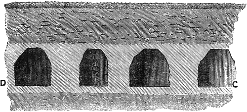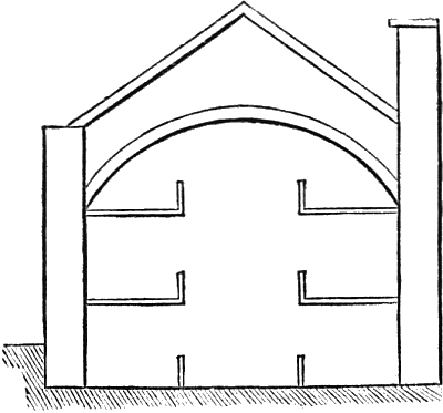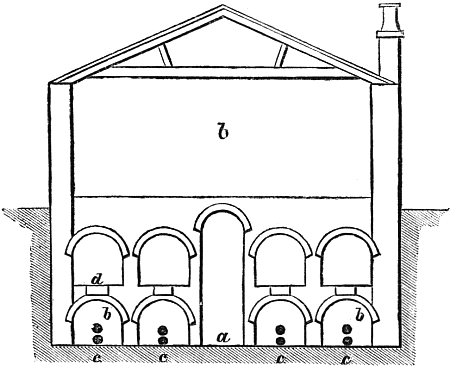 A shed of this description is an indispensable adjunct to every well-ordered garden, and in the present case it serves as a roof to the mushroom-house. In the centre of each vault, shown in fig. 7, a circular ventilator, d, 9 in. in diameter, should be made, having a stone and cast-iron stopper, with a folding ring. The whole roof of the mushroom-house is covered over with pavement, which at the same time forms the floor of the shed above. Mr. Forsyth objects to cast-iron shelves “on account of the rust, and to slate shelves, as being cold and damp, and therefore not suitable to the purpose;” but he knows of no objection to shelves built of bricks and mortar, kerbed with hewn stone 3 in. wide, and clamped together with lead.