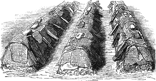 I will now quote a few words from Mr. Ayres on other materials for forming mushroom-beds than stable manure. He has given this, like almost every important subject in the range of horticulture, some attention. First among these may be mentioned sawdust which has been used for bedding horses or for riding-school tracks. Such a substance, thoroughly impregnated with urine and mixed with horse-droppings, forms an excellent material for mushroom-beds, especially if mixed with one-fourth of good fibrous loam. Such materials mixed and fermented together, and thrown into a bed a foot or eighteen inches in thickness, according to the temperature of the shed in which the bed is made, will be found to form capital material for growing this esculent, especially as it retains the heat for a long time. The worst of it is that the material is almost valueless after it has served the first purpose; and used as dung upon light land is rather injurious than otherwise. Then you may use leaves and loam, in the proportion of one part of the latter, in a turfy state, to four or five of fermenting leaves.[20] These may be recently gathered from the trees, and should be allowed to attain a brisk heat before the loam is added, and then, after sweating for a week or ten days, may be turned, mixing the materials intimately together, and then the mass may be formed into a bed. A mushroom-bed of this kind should not be less than fifteen inches in thickness when thoroughly consolidated; and when so managed it will grow mushrooms just as well as dung. The sweepings of our streets and cattle markets, especially those parts that are paved and much frequented by horses—as, for example, cabstands, &c.—if collected when dry, and fermented a little, yield capital material for beds. Here from the cattle market we have the dung of horses, sheep, and cows mixed together in a finely divided state, the heating of which is gentle and regular. Material of this kind procured on dry days, thrown together to ferment once or twice, and then made into well-consolidated beds, will produce mushrooms of the finest quality, and continue in bearing a very long time. It is of the first importance that this material be collected in a dry state, as of course the slush of the streets would not do at all. Equal proportions of street sweepings and fresh leaves, properly fermented and mixed with loam, would perhaps make as good material for growing mushrooms as need be obtained. Of course the sweepings from those parts of the town most frequented by horses will be the best for the purpose I am writing about.