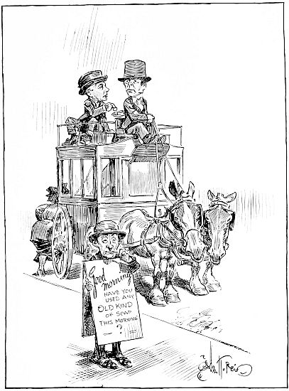 I went to a barber shop, a first-class one. I was shaved for a “tuppence” (four American cents) and had my hair cut for a “trippence” (six American cents). I gave the barber a tip of a penny, for which he was very thankful, and then I went out of the shop growling at a country where I could get shaved so cheaply and where a tailor-made suit cost only $12. In this world of ours we are so dependent on one another that you can’t[184] cheapen one man without cheapening all the rest. I asked the street-car conductor and he told me he was paid five dollars a week—and he has a family of six. The chamber-maid at the hotel works for a dollar a week and board. A good coachman or a house-man gets one to two dollars a week and board. A clerk in a store does well to beat five dollars a week. How do they live? I don’t know, but they do; but they have all heard of America and Canada and Australia, and would go there if they could raise the fare, or if it were not for leaving family and home.