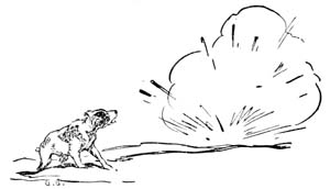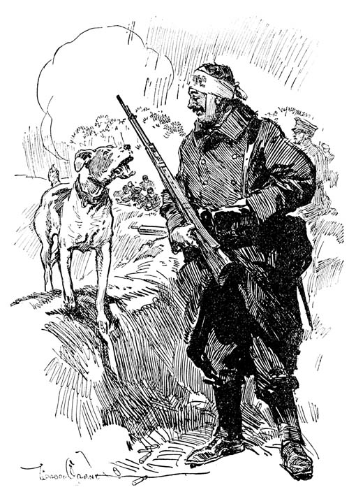One of the tin cans, dislodged by Pierrot’s eager nose, rolled noisily down the bank, and the sentry opposite halted and raised his rifle quickly to his shoulder. Pierrot crouched back, watching him. The soldier evidently thought better of arousing his comrades with a rifle shot, and suspecting that some animal was prowling about, picked up a stone and threw it at Pierrot. It struck with a thud beside him and bounded up into the bushes. Pierrot, thoroughly alarmed but still hungry, seized a large bone in his teeth and dashed back through the bushes. Not waiting to ascertain whether he was pursued, he ran for a mile across the frozen fields on his three weary legs before he came to a stop. Then, making sure that he had fully escaped the danger that threatened, he fell upon his stomach on the hard ground with the bone between his paws, and spent a contented half-hour[Pg 83] crunching it until the last vestige had disappeared.