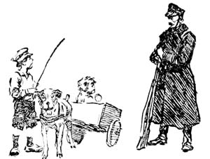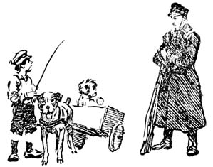 Arriving at the corner of a street that crossed the avenue, they were halted by an officious Garde de Ville with fierce-looking moustaches. He wore a blue uniform with a silver band on his cap, and a terrifying sabre hung by his side. Behind him stood a very dejected woman with her dog and cart, waiting until he should find time to take her to the station. Perhaps he had found that her milk was not fresh or had been watered.
