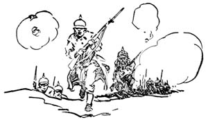 [Pg 104]A few days later they heard again the tramp of marching feet on the road, and from their doorway watched a company of German soldiers file past. Mère Marie was not afraid of them now; it seemed to her that they had done their worst. Gran’père stood very erect and grim and silent, but wee Lisa suddenly ran out with a glad little cry, waving her arms. In the company she had recognized her Bavarian friend. He turned his head for a moment, but his face was expressionless, and he did not leave the ranks. So Lisa wept with disappointment.