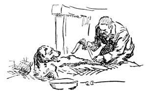 When the water was warm the woman took an old rag and washed Pierrot’s wound. He awoke and thumped his tail on the hard earthen floor, for the warm water felt very good. Then the woman tied the rag about his leg and bade him lie quiet.