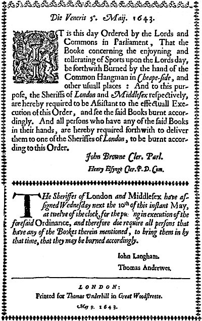 The King therefore commanded that no recreations should be denied to his subjects which did not militate against the laws and the canons of the Church. “And as for our good people’s lawful recreation, our pleasure likewise is that after the end of divine services our good people may not be disturbed, letted, or discouraged from any lawful recreation, such as dancing, either men or women, archery for men, leaping, vaulting, or any other such harmless recreation: nor from having of May games, Whitsun ales, and Morris dances, and the setting up of May-poles, and other sports therewith used, as the same be had in due and convenient time without impediment or neglect of divine service; and that women shall have leave to carry rushes to the church for the decorating of it, according to their old custom. But withall, we do here account still as prohibited all unlawful games to be used upon Sunday only, as bear and bull-baiting, interludes, and, at all times in the meaner sort of people by law prohibited, bowling.”