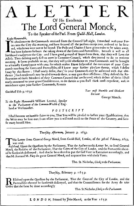 This Letter from General George Monck from Guild-Hall, London, of the 9th of February, 1659, was read.