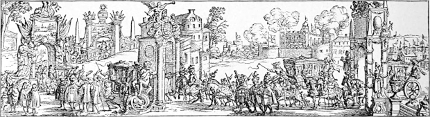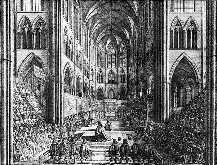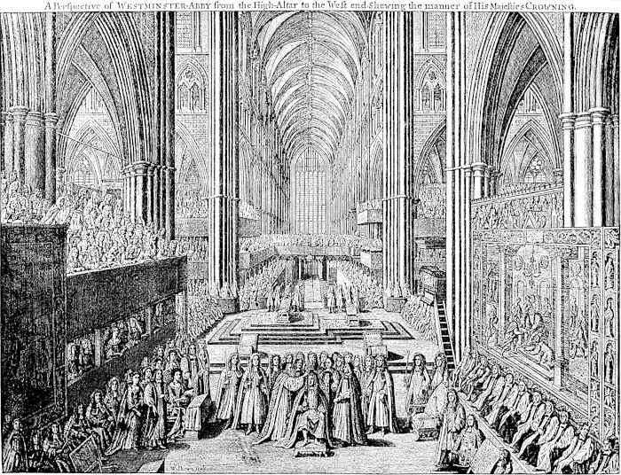James left Edinburgh on the 5th of April, arriving at Theobalds, where he rested for four days, on May the 7th; it had taken more than a month to ride from Edinburgh, i.e. he had ridden about twelve miles a day. At Waltham he was met by one of the sheriffs with sixty servants; at Stamford Hill by the Mayor and Aldermen in velvet and gold chains and 500 citizens richly apparelled. At that moment the Plague broke out; the Coronation was shorn of its splendour; the pageants and shows were laid aside; only the Mayor, Aldermen, and twelve citizens were present in Westminster Abbey; and James had to postpone his public entry into the City for a twelvemonth.