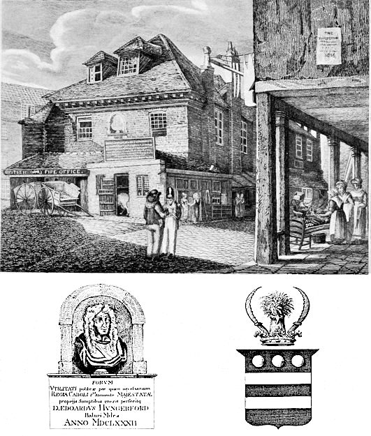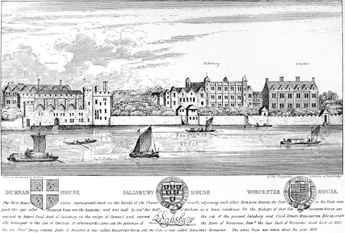 The three Houses above represented, stood on the banks of the Thames nearly adjoining each other. Durham House, the first in the Plate, occupied the spot called Durham Yard, now the Adelphi, and was built by Anty. Bec Bishp. of Durham, as a town residence for the Bishops of that See. Salisbury House was erected by Robert Cecil, Earl of Salisbury, in the reign of James I. and covered the site of the present Salisbury and Cecil Streets. Worcester House, originally belonged to the See of Carlisle. It afterwards came into the possession of the Earls of Worcester. Edwd. the last Earl of Worcester died here in 1627. His son Heny. being created Duke of Beaufort, it was called Beaufort House, and the Site is now called Beaufort Buildings. The above View was taken about the year 1630.