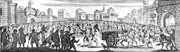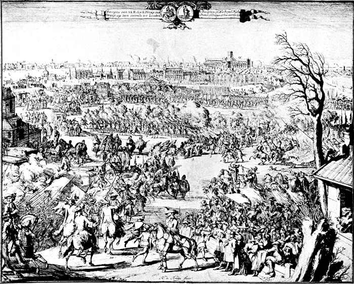 On the 28th of April, Charles was proclaimed King at Ludgate Hill, himself being present. On the 1st of May he was married by proxy in Paris to Henrietta Maria. The new Queen came over at once, and received a kindly welcome from the citizens. The public entry, which was arranged for June 18, was postponed on account of another outbreak of plague. The number of deaths from this visitation is returned at 35,417, about one-third of the whole population. As in 1603, and later on in 1665, the richer sort hurried out of the town on the first outbreak, leaving behind them the population which cannot leave the place of work, namely, the apprentices, craftsmen, servants, and porters. The rich carried away what they could, but they were refused entrance into the villages, even the barns being closed to them. Many of them died on the highway, their pockets stuffed with money.