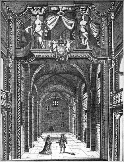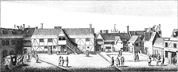 The Red Bull Playhouse stood on a plot of ground lately called “Red Bull Yard” near the upper end of St. John’s Street Clerkenwell; and is traditionally said to have been the Theatre at which Shakespeare first held a gentleman’s horses. In the civil wars it became highly celebrated for the representations of Drolls, to a collection of which pieces published by Frauncis Kirkman in 1672, this view of it forms a frontispiece. The figures brought together on the stage are intended as portraits of the leading actors in each Droll. The one playing Simpleton is Robert Cox, then a great favourite, of whom the publisher thus speaks in his preface. “I have seen the Red Bull Playhouse which was a large one, so full that as many went back for want of room as had entred. Robert Cox, a principal actor and contriver of these pieces, how have I heard him cryed up for his John Swabber, and Simpleton, the Smith. In which latter, he being to appear with a large piece of Bread & Butter, on the stage I have frequently known some of the female spectators to long for it”. The above print may be regarded not only as highly curious for the place it represents, but as a unique specimen of the interior economy of our antient English Theatres.
