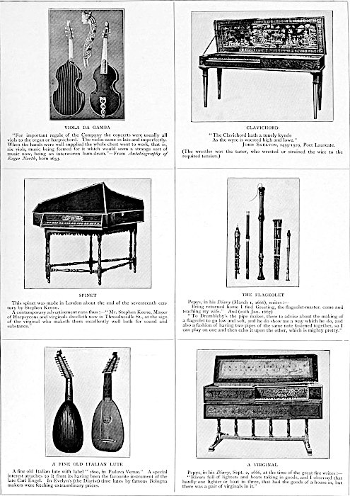 “For important regale of the Company the concerts were usually all viols to the organ or harpsichord. The violin came in late and imperfectly. When the hands were well supplied the whole chest went to work, that is, six viols, music being formed for it which would seem a strange sort of music now, being an interwoven hum-drum.”—From Autobiography of Roger North, born 1653.