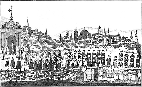 One Pretender removed, another arose. Perkin Warbeck professed, as we know, to be the younger son of Edward IV., namely, Richard, Duke of York, who, it was pretended, had escaped from the Tower. The strange adventures of Perkin are told in every history of England. He is connected with that of London on three occasions. The first was after his abortive attempt to land in Kent. The Kentish men, refusing to join him, attacked his followers, drove some of them back to their ships, and took7 prisoners a hundred and sixty men with four Captains. These prisoners were all brought to London roped together, a curious sight to see. Those who lived on London Bridge saw many strange sights, but seldom anything more strange than these poor prisoners, who were not Englishmen but aliens, thus tied together. They were all hanged, every one: some on the seashore, where their bodies might warn other aliens not to come filibustering into England; and the rest at Tyburn.