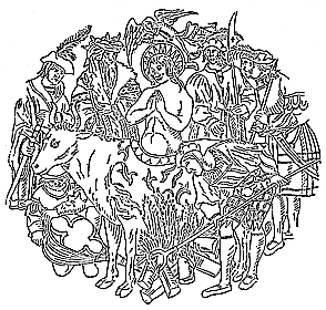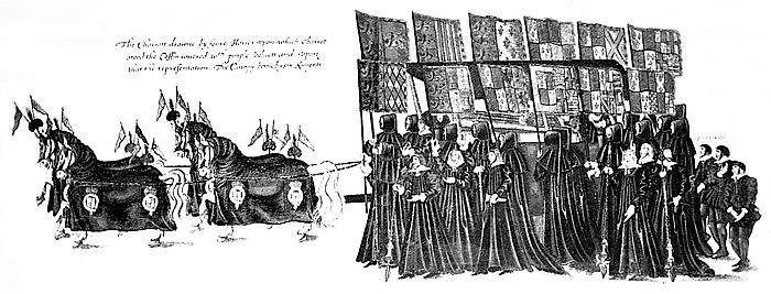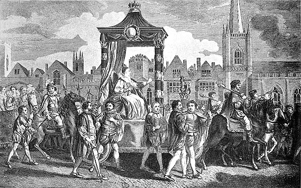 Henry rode to London immediately after his victory. At Shoreditch he was received by the Mayor, Sheriffs, and Aldermen, clothed in violet and bearing a gift of a thousand marks. He then went on to St. Paul’s and there deposited three standards—on one was the image of St. George, on another a “red fierie dragon beaten upon white and greene sarcenet,” and on the third was painted “a dun cow upon yellow tarterne.” He also heard a Te Deum.
