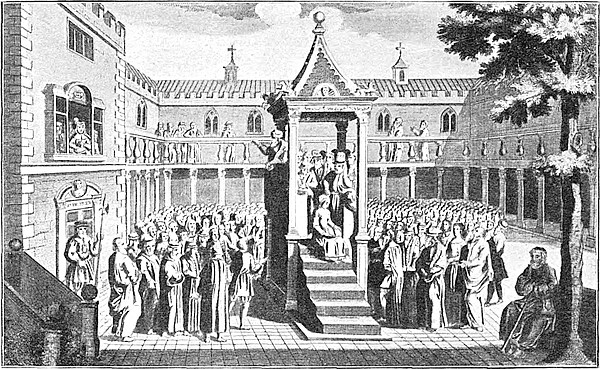 The next episode in Perkin’s career which touches London is that ride which he undertook, very much against his will, from Westminster to the Tower. Everybody knows how he gave himself up to the Prior of Shene. The King granted him his life, but he imposed certain conditions. He was placed in the stocks opposite the entrance to Westminster Hall, where he sat the whole day long, receiving “innumerable reproaches, mocks and scornings.” The day after he was carried through London on horseback, in sham triumph. They were ingenious in those days in their methods of putting offenders to open shame. At an earlier date the traitor Turberville had to ride in shameful guise; and when Lord Audley, Captain of the Cornish Rebels, was led out to execution, he was attired in a paper robe painted with his arms, the robe being slashed and torn. No doubt Perkin was handsomely attired in coloured paper, with a tinsel crown upon his head; no doubt, too, he bestrode a villainous hack, while all the ’prentices of London ran after him, laughing and mocking. They placed him on a scaffold by the Standard in Chepe and kept him there all day long. In the course of the day he read aloud his own confession, which is a very curious document.