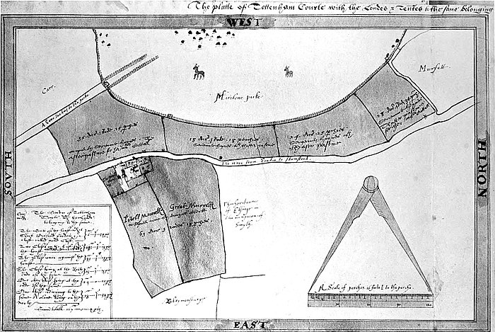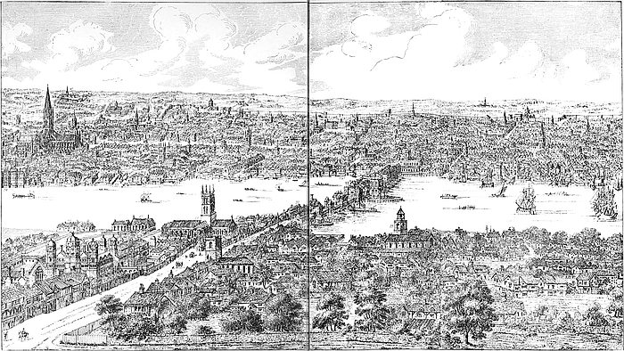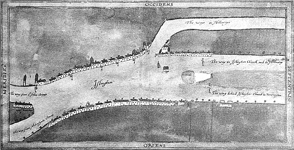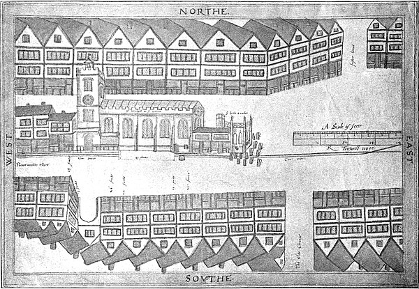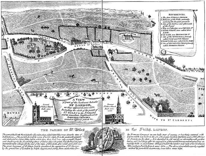 “The part of the North West Suburbs of London, since called Saint Giles’s, was about the time of the Norman Conquest an un-built tract of country, or but thinly scattered with habitations.—The parish derived its name if not its origin from the ancient Hospital for Lepers, which was built on the site of the present church by MATILDA queen of King Henry I. and dedicated to Saint Giles: before which time there had only been a small Chapel or Oratory on the spot.—It is described in old records, as abounding with gardens and dwellings in the flourishing times of Saint Giles’s Hospital but declined in population and buildings after the suppression of that establishment, and remained but an inconsiderable village till the end of the reign of Elizabeth, after which period it was rapidly built on, and became distinguished for the number and rank of its inhabitants. The great increase of St. Giles’s Parish occasioned the separation of St. George’s Bloomsbury Parish from it anno 1734.—The above view (which is partly supplied by the great Plan of London by Ralph Aggas, and partly from authorities furnished by parochial documents) was taken anno 1570.”