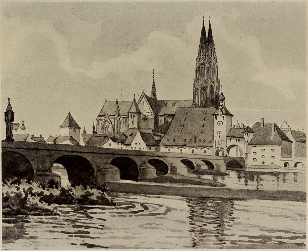 After Sigmaringen is left behind the valley is less narrow, and the river goes on past small villages and old towns, each of which has no doubt its interest for the leisurely pedestrian. Beyond Reidlingen on the left bank is seen on the right the isolated hill of Bussen, from the summit of which is to be had a view embracing the whole of Upper Swabia and much of the Alps. On the hill is a pilgrimage church and a ruined castle The ruined castles are so numerous along parts of the[Pg 8] river that is not possible to pause at all; for it would appear as though in the good old times the population largely consisted of castle-dwelling barons. Zweifaltendorf has a stalactite cave; Rechtenstein, with another ruined castle, is a notably beautiful spot; Ober-Marchtal has a grand old Premonstratensian monastery; while Munderkirchen, built upon a rock islanded by the forking river, has a new stone bridge with an arch span of one hundred and sixty-four feet. Beyond this the valley is wider. At the village of Ehingen, the railway turns northward from the river, which between here and Ulm receives several affluents from the south, including just before Ulm the Iller, while at Ulm itself, the river Blau comes in from a delightfully wooded and rocky valley on the left.