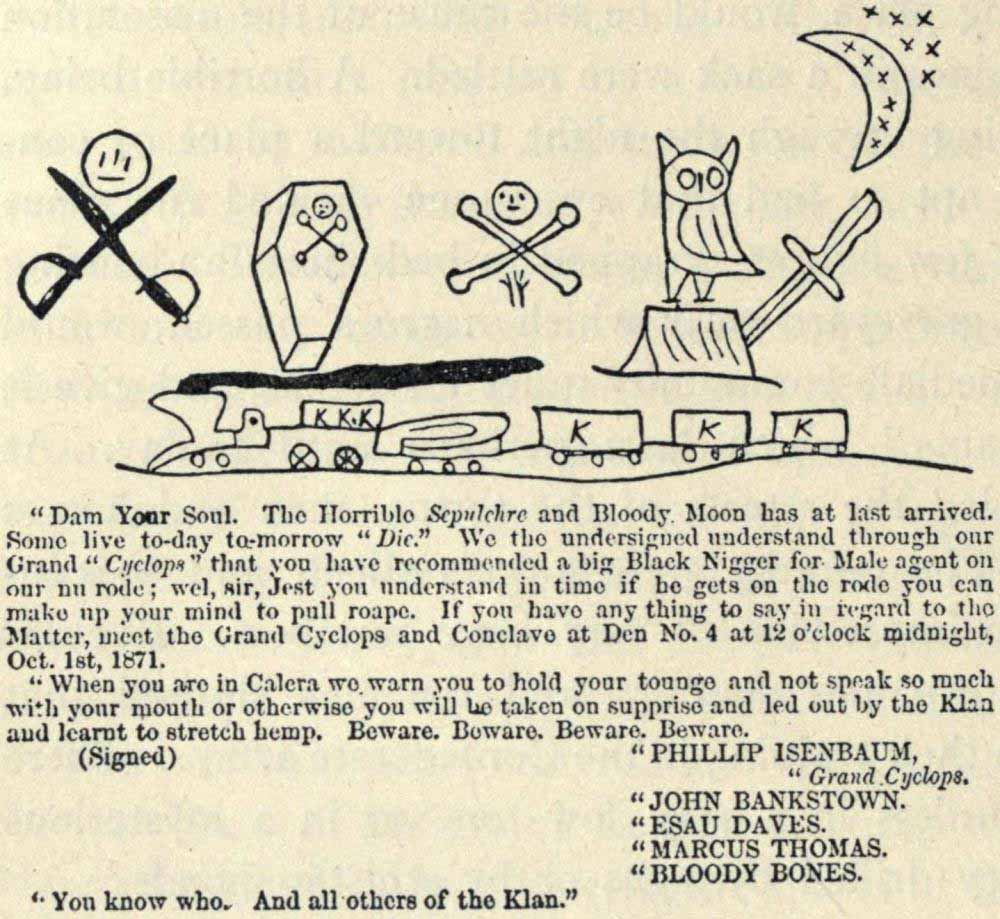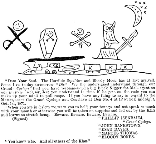 [2107] Nordhoff, “Cotton States in 1870,” pp. 85, 86; Ku Klux Rept., Ala. Test., pp. 185, 209, 210, 434, 435, 1879.
