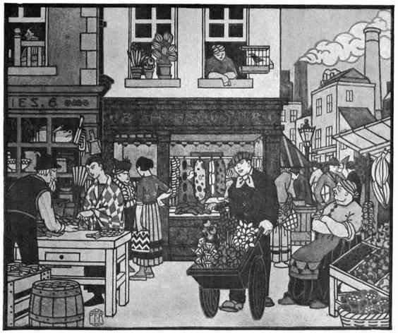 In the sense of housing we have never housed our poor; hardly anywhere, up to 1900 or so, have we done anything but run up rude brick boxes as shelters, or adapt the dwellings of the rich. Hence, I believe, a stricken, scrofulous generation. Yes, I know there is a charm about all this black filth, as if, indeed, flowers did sprout from dunghills. It is the charm of contrast, it is singularity. You feel it in every poor region. You feel it at the Elephant and Castle, for instance, though why the Elephant should alone be famous, while at the two opposite corners sit the Rockingham and Alfred’s Head, equally great public-houses, I do not know; you feel it in the rowdiness of London Road, and in a sort of ‘none-of-your-lip’ air that hangs over Newington95 Causeway. You feel it still more in Deptford; indeed, Deptford is a pitiful place, all gray stone and gray slate, but the smell of the sea hangs about it, and as it lies along the docks, often above these slate roofs, above the timber stacks of strange wood, you see the tangled masts and cranes cut out against the sky, patterns evidently designed by Nevinson. I remember once seeing on the shoulder of an old woman who kept a stationer’s shop, a gorgeous parrot. It had a yellow and blue body, scarlet feathers in its tail, a bill of ebony, and eyes like molten gold. It sat on her shoulder, thinking of things old as the willow pattern. The parrot looked out upon Deptford High Street, through the flaming topaz of its eyes at the young men who passed now and then, sun-burnt starvelings of the merchant service, in blue jerseys; the sailors rolled and the parrot thought, and in the heat the East breathed from the logs of mahogany and sandalwood. But under all that, under all that theatrical charm was buried the same old thing, the bad old house made to fit the bad new time.