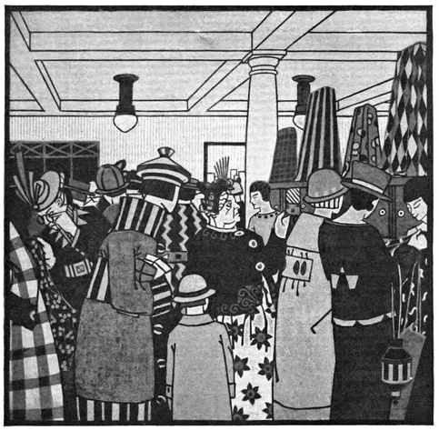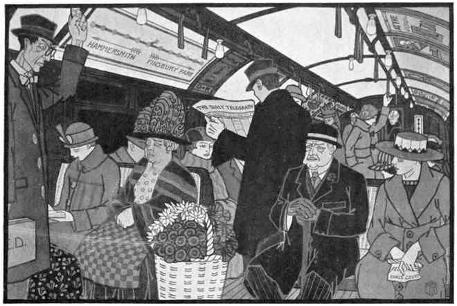 Sometimes they saw people whose names could serve as conversation at the morrow’s lunch party. Sometimes they caught sight of Mr C. R. W. Nevinson, and could describe his square figure, his rather blunt, pleasant face with the bright, live, brown eyes. It does one good to look at Mr Nevinson, though, nowadays, something oppressed has crept into his expression; there is, in those rather thick features, a sense of life and desire. With him sometimes goes his wife, slight, white and rose, and bending a little under the heavy sunshine of her hair.