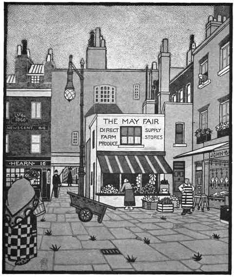 Wherever flows London stone the slits exist. A deep, dark archway out of Surrey Street dives under the Norfolk Hotel; follow it, go down Surrey Steps, and you shall come to a water-gate, on which you may yet lean and smell the tar of Henry Fitz Alwyn’s barge. Another slit, behind the Alexandra Hotel, will lead you through Old Barrack Yard (I do not know what barrack) and past low, industrial cottages, to the petrified splendours of Belgravia. I wish I knew them all, for I discovered yet another last week, after overlooking it for over sixteen years. It is called St James’s Market, and leads off the Haymarket, towards the neat elegancies of Jermyn Street. That does not sound promising; yet, lost among the backs of warehouses and restaurants, there stands a long, low house coated with green plaster; it is a workshop, but some sense of fitness had bidden the workers relieve its green walls with claret curtains. I choose to be sure that in this house Axford tried to imprison Hannah Lightfoot, until the fair Quakeress fled to her Georgian lover.