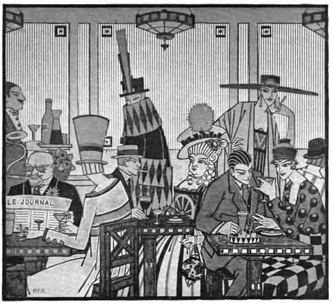 This does not mean that the Café Royal is a literary café, or an artistic café. The literary, dramatic, and pictorial elements are certainly stronger there than in any other London resort, but at any time you may see there the strangest assembly: foreigners, a great many; smart people who are seeing life; and very dull, ordinary, fat men who stop on their way from business or shop to have a drink before dinner. At dinner time the room is not itself, for half of it sees its marble tables covered with cloths, which means that eating proceeds, and eating does not, so well as123 drinking, favour turbulent debate. It is just before dinner, and especially after dinner, that the Café Royal enters upon its true function: to provide a pleasant, cheap place, fairly noisy, fairly smoky, and fairly comfortable, where the young arts may meet and joust. During the war it did not quite do this, for many of the young men had joined the army, and it was strange suddenly to recognise over a tunic, in a well-kept, well-brushed head, the outlines of somebody whom once one knew with endless locks, whiskers, or a beard. Even in khaki they did what they could. Military discipline did not completely dominate those rebellious beings; their moustaches were either a little more luxuriant or very much more hogged than usual. The Café Royal platoon was still faintly noticeable.