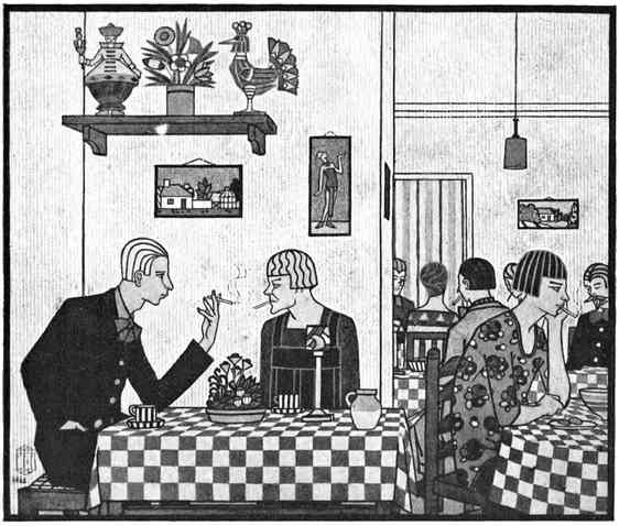Some, however, were not in khaki, for theirs was not a very fit generation, and even now many a table throws back a memory to 1914. In those days the frequent visitor to the Café Royal soon knew many people by sight, and if he was of that world, or had somebody to guide him, he soon could pick out those who were celebrated and those who were notorious; with time, he even came to recognise those who were extremely well known. I do not know if, nowadays, one often sees at the Café Royal, Mr Jacob Epstein, but once it was difficult to detach one’s eyes from the sleepy strength of his heavy profile. One wanted to look into those eyes with the thick lids, in which strangely mingled so much detachment and so much kinetic energy. He was seldom alone; there was always a little Epstein group about his table. Indeed, it is a characteristic of the Café Royal that few people sit alone. They form groups. One I remember well. It always contained a tall young man with very long, thin features, and hair grown low about the cheek; he had a fancy for clothes faintly 1860 in feeling, notably, for stocks. There was an extremely beautiful girl, thin, dark, and languid as some warm Italian greyhound. There was a young man who wore a velvet coat, whose fair hair fell in long wisps upon his collar, a strange young man, with a peculiar grayish skin and an air of nervous excitement. Round these moved other figures less definite, but all of them124 young: square men in knickerbockers, with short pipes stuck precisely in the middle of their faces; girls, outrageously florid or eloquently simple, round whose long necks hung the flowered yokes of Chelsea, on whose hands clustered many rings of turquoise and aquamarine, or whose hands were virgin of all decoration save that of black finger-nails. The smart people used to watch them steadily and feel that, at last, they were really seeing life.