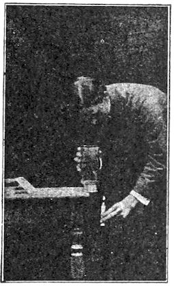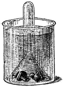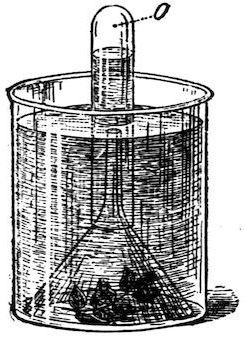 4Experiment to show the Cause of Burning, or Oxidation.—Obtain a large glass bottle (a pickle jar), a short candle, and some matches. Light the candle and put it on a table near the edge, and cover it with the glass jar. The flame slowly smothers and goes out. Why is this? Is the air now in the jar different from that which was in it before the candle was lighted? Some change must have taken place or the candle would continue to burn. To try whether the candle will burn again under the jar without changing the air, slide the jar to the edge of the table and let the candle drop out. Light the candle and slip it up into the jar again, the jar being held with its mouth a little over the edge of the table to receive the candle (Fig. 5). The flame goes out at once. Evidently the air in the jar is not the same as the air outside. Take up the jar and wave it to and fro a few times, so as to remove the old air and admit fresh air. The candle now burns in it with as bright a flame as at first. So we conclude that the candle will not continue to burn unless there is a constant supply of fresh air. The gas formed by the burning is carbon dioxide. It is the gas from which plants extract carbon. (Beginners’ Botany, Chap. XIII.) One test for the presence of this gas is that it forms a white, chalky cloud in lime water; another is that it smothers a fire.