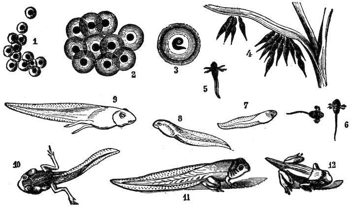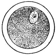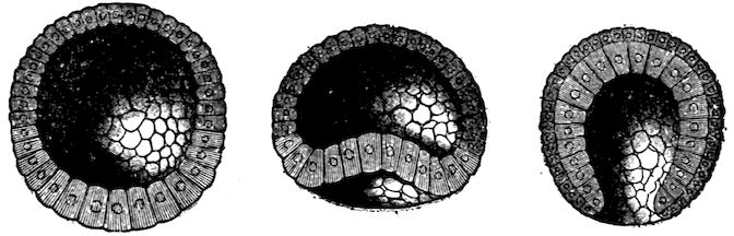 Fig. 7.—Egg cell subdivides into many cells forming a sphere (morula) containing a liquid. A dimple forms and deepens to form the next stage (gastrula).