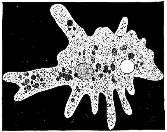 The amœba belongs in the class of protozoans called Rhizopoda “root footed.”