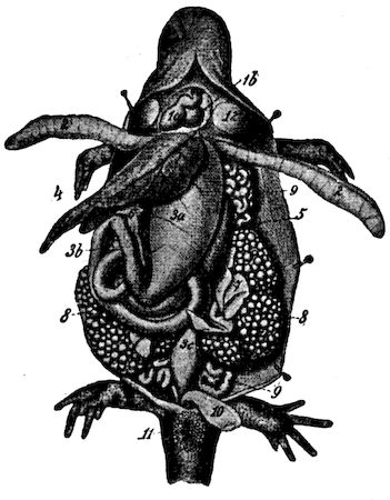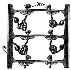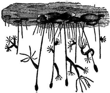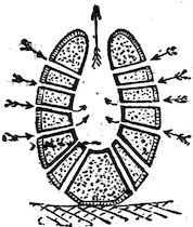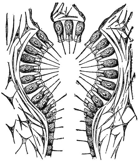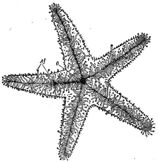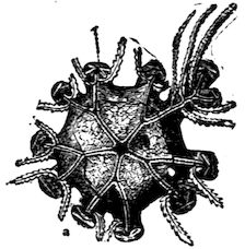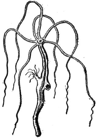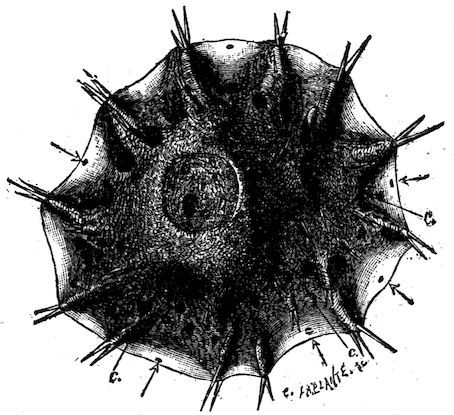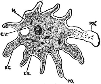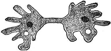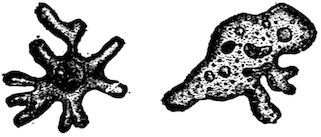 Note the central portion and the slender prolongations or pseudopods (Greek, false feet). Does the endoplasm extend into the pseudopods? (Fig. 10.) Are the pseudopods arranged with any regularity?