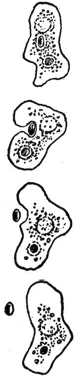 Reproduction.—Sometimes an amœba is seen dividing into two parts. A narrowing takes place in the middle; the nucleus also divides, a part going to each portion (Fig. 13). The mother amœba finally divides into two daughter amœbas. Sex is wanting.