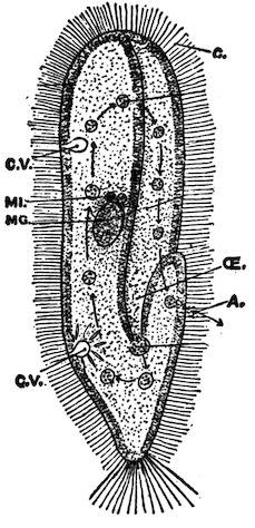 We thus see that the paramecium, though of only one cell, is a much more complex and advanced animal than the amœba. The tiny paddles, or cilia, the mouth-groove, etc., have their special duties similar to the specialized organs of the many-celled animals to be studied later.